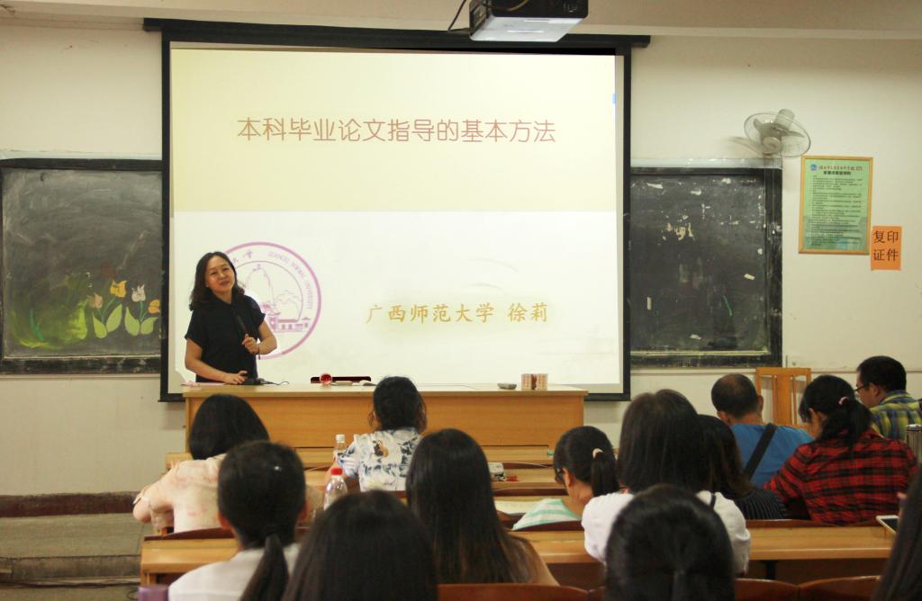 本次活动邀请了“专本衔接”主考院校的专家到我校进行指导,广西师范大学教育学部的徐莉教授为我校老师做了精彩的专题讲座,徐教授强调了本科毕业论文在整个本科课程中的重要地位,针对本科毕业论文的写作规范从论文的选题、构成及写作注意事项等多方面进行了详细的讲解,并就往年毕业论文写作过程中出现的问题进行了分析,提出了改进意见,希望在今后的论文指导中对学生严格要求,把好质量关。在互动环节,专家对老师们提出的问题及困惑进行了一一解答。