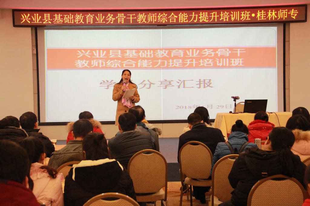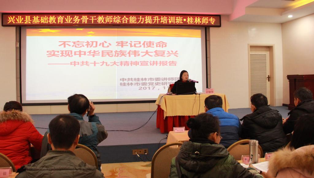 此次培训是基于贯彻落实党的十九大精神和习近平新时代中国特色社会主义思想,进一步加强兴业县教师队伍建设开展的培训。我校继续教育中心针对“提升兴业县基础教育骨干教师综合能力”这一主题,围绕十九大报告学习辅导、师德养成、中小学教师心理健康、校园安全事故的预防及校园文化建设等内容,采取专题讲座、案例研讨及现场教学等方式,使学员加强理想信念、开阔视野、更新理念、提升能力。