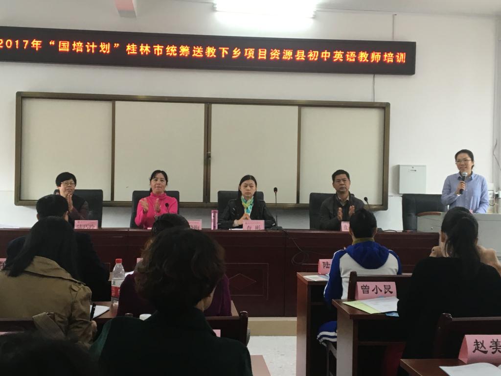 10月19日上午八点半,由外语与旅游系承办的2017年“国培计划”桂林市统筹送教下乡项目资源县中小学英语教师培训班(第一期)分别在资源县民族中学和资源县第二小学举行开班典礼。出席开班典礼的有桂林市教育局师培中心和资源县教育局的相关领导、外语与旅游系工作人员,以及来自资源县各乡镇的90名中小学英语教师。